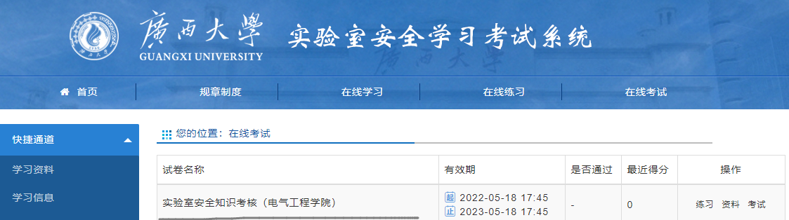 请在5月31日前登录广西大学实验室安全学习考试系统(http://xdsys.gxu.edu.cn/)进行安全教育考试。试卷名称:实验室安全知识考核(电气工程学院),满分为100分,88分合格。