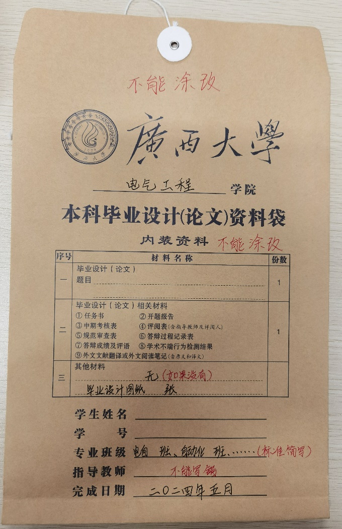 2、各班班长、团支书收齐后,到104找教学秘书拷贝,文件夹命名为:2024届本科毕设归档材料(2024级)-XX班(班级简称)。