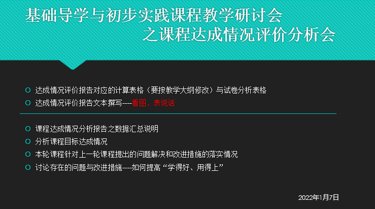 为总结基础导学与初步实践课程2021-2022(1)学期的教学情况,2022年1月7日下午3点课程组在312开展课程达成情况评价分析会。分析会上展示了本这期全体学生学习的相关数据,并对课程达成情况和答卷情况进行了说明,总结了课程的不足,并讨论了改进措施。