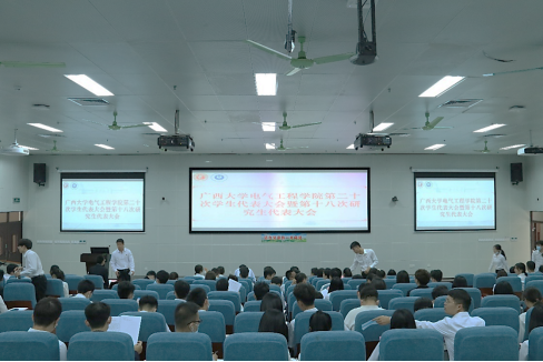 10月12日下午,广西大学电气工程学院第二十次学生代表大会暨第十八次研究生代表大会、第二次众创空间学生代表大会在第六教学楼六二阶报告厅召开。学院党委副书记梁志坚、学院团委书记石建有,以及学工组全体辅导员、众创空间指导老师李勇,研究生会、学生会代表,众创空间代表、各班级代表共112名学生代表参加了本次大会。