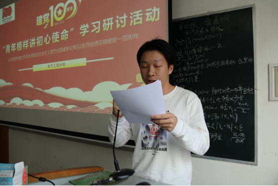 接着,信创201班团支书李欣蔚以“党史学习,一心向党”为主题发表了演讲。她结合四史学习和高考的经历,为大家分享了在习近平《论中国共产党历史》书中学到的:长征途中红三十一军九十三师七四团中的“半截皮带”的故事以及感悟心得。表达青年学子要学习伟大长征精神,坚定革命的理想和信念,坚持革命高于天的坚定信仰,努力奋斗,走好新时代长征路。