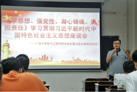 为深入开展学习贯彻习近平新时代中国特色社会主义思想主题教育,明确主题教育的重大意义、总要求、目标任务和重点措施。2023年4月27日,电气工程学院本科生第三党支部在电气工程学院304开展了学习贯彻习近平新时代中国特色社会主义思想主题教育座谈交流会。会议邀请到了广西大学马克思主义学院新时代大学生理论宣讲团做导学,马克思主义学院团委副书记、广西大学马克思主义学院新时代大学生理论宣讲团指导老师莫凯洋出席座谈会,本三支部宣传委员李浩铭老师主持座谈会。