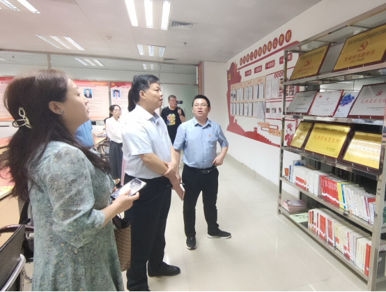 在双方交流分享经验之后,由梁志坚书记带领蔡晓琳书记一行人到综合楼107党员工作室、综合楼110“三合一”红色阵地与综合楼105党员创新活动实践基地进行实地参观,并由徐俊华书记对研二支部样板支部建设成果进行介绍。在参观过程中,双方领导表示研二支部推动党建工作和实践工作深度融合的做法对党建工作具有重要的教育意义,蔡晓琳书记也赞扬了将支部活动场地建设与实验室建设有机结合、红色文化思想教育围绕党员生活实际的建设成果。