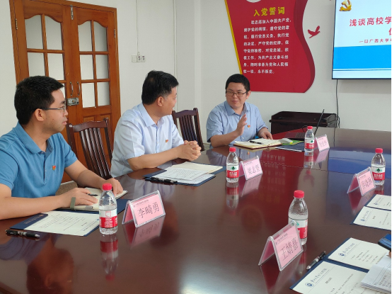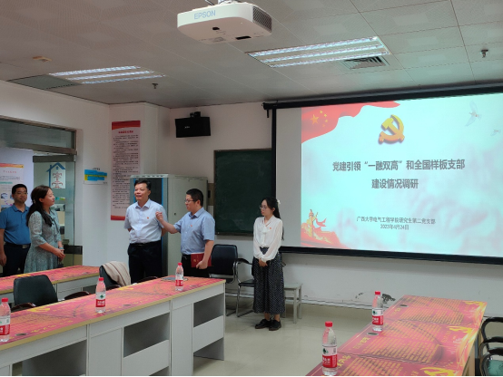 调研活动议程如下:广西大学电气工程学院党委书记梁志坚介绍学院党建引领“一融双高”建设、东北财经大学统计学院党总支书记蔡晓琳介绍调研内容、电气工程学院研究生第二党支部书记徐俊华介绍全国样板支部建设情况及亮点、双方交流、参观广西大学电气工程学院研究生第二党支部活动室。