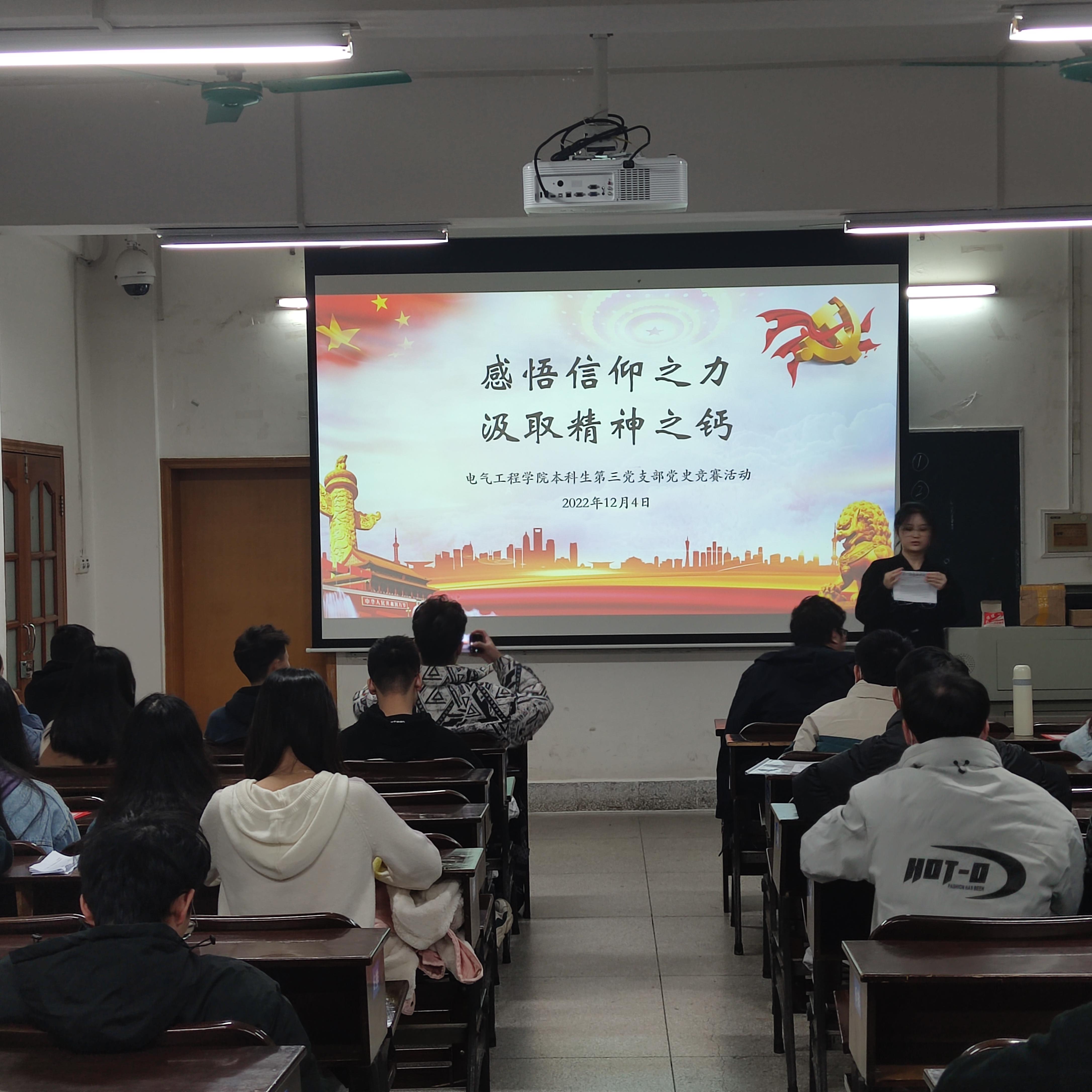 2022年12月4日,电气工程学院本科生第三党支部在电气工程学院304开展了“感悟信仰之力,汲取精神之钙”主题党史知识竞赛活动。本次党日活动以庆祝中国共产党第二十次全国代表大会胜利召开为契机,以习近平新时代中国特色社会主义思想和党的二十大精神为指导,重温党史,引导支部成员们热爱党、热爱祖国,宣传弘扬先辈革命精神,恪守初心、砥砺前行。