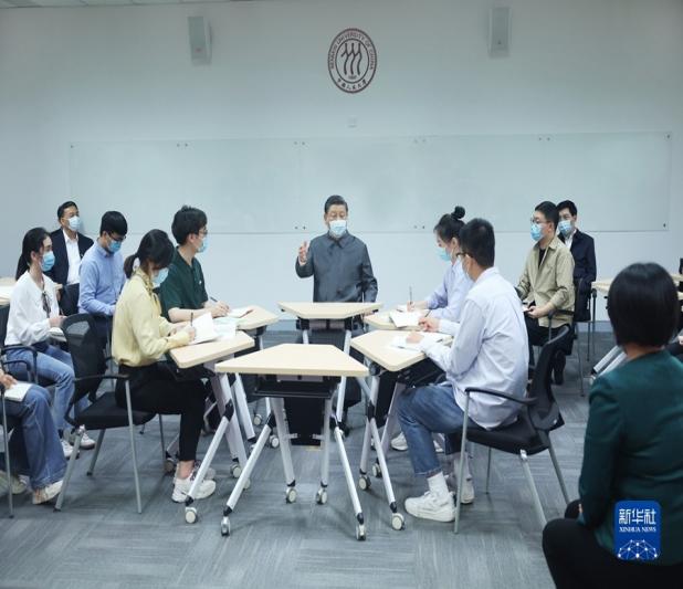 2022年4月25日上午,中共中央总书记、国家主席、中央军委主席习近平同志在中国人民大学进行考察调研。习近平总书记先后来到思政课智慧教室、博物馆、图书馆,了解学校促进思政课教育改革创新、学校历史沿革、教学科研成果、加强文献古籍保护利用和促进理论研究成果转化应用等情况,并主持召开师生代表座谈会。习近平总书记在考察时强调各高校应当坚持党的领导传承红色基因扎根中国大地走出一条,建设中国特色世界一流大学新路。