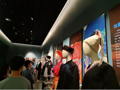 跟随着博物馆讲解员的脚步,我们依次参观了五彩八桂、霓裳羽衣、穿越时空的鼓声、壮族文化展和百年老物件展等展厅。知晓了广西境内山地丘陵绵延起伏,江河溪滨盘曲蜿蜒的地理风光,古往今来,各民族在这片山水如画的土地上辛勤劳作,和谐共处,交流互鉴,因地制宜建造出独具地方特色的壮美家园;欣赏了广西十二个世居民族的服饰特点,其纺织工艺传统古朴,世代传承,如灿烂星空般不朽,它们为中华服饰增添了无限光彩,展现出百变多样的服饰特征与文化特色;还有参观博物馆征集的20世纪以来的老物件,立足于展柜前,看着这些老百姓身边的物件,看似平凡普通,却隐含深意,它们见证了波澜壮阔的民族复兴,承载着日新月异的社会变革,记录了血肉丰满的人生历程。