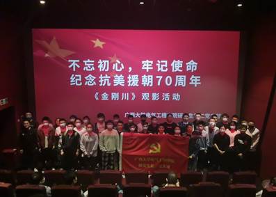为纪念中国人民志愿军抗美援朝出国作战70周年,深入推进“不忘初心、牢记使命”主题教育,缅怀革命先烈,弘扬红色精神,提高党性修养,2020年10月30日晚,电气工程学院研究生第二党支部组织开展爱国主义观影活动,支部内的52位同志在副书记袁榕基的带领下观看了电影《金刚川》。