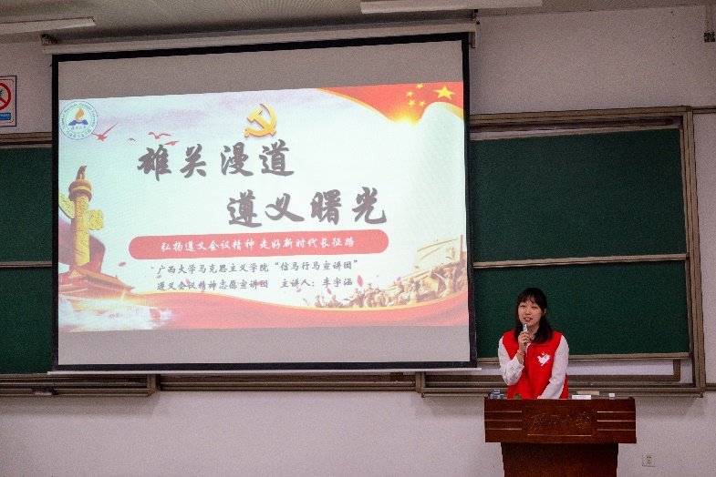 李宇涵同志是马克思主义学院、国外马克思主义研究方向2023级硕士研究生,她在本次宣讲会中为我们讲述了长征路上的雄关漫道,遵义会议是如何在党的生死攸关时带来曙光。在习近平总书记坚强有力的领导下,以习近平新时代中国特色社会主义思想为指导,我们踏上了新时代长征路,我们更应弘扬遵义会议精神,走好新时代长征路!