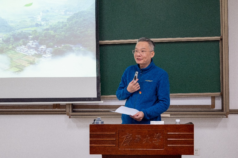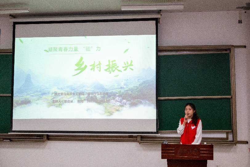 蒙佳慧同志是马克思主义学院2022级哲学专业本科生,她在本次宣讲会通过介绍我们广西大学校友杨宁同志的伟大事迹为我们讲述凝聚青春力量,“驻”力乡村振兴的故事,全面建设社会主义现代化国家,最艰巨最繁重的任务仍然在农村,在习近平总书记的坚强领导下,在全国各族人民的共同努力下,我们必将全面推进乡村振兴战略实施,以中国式现代化全面推进中华民族伟大复兴。